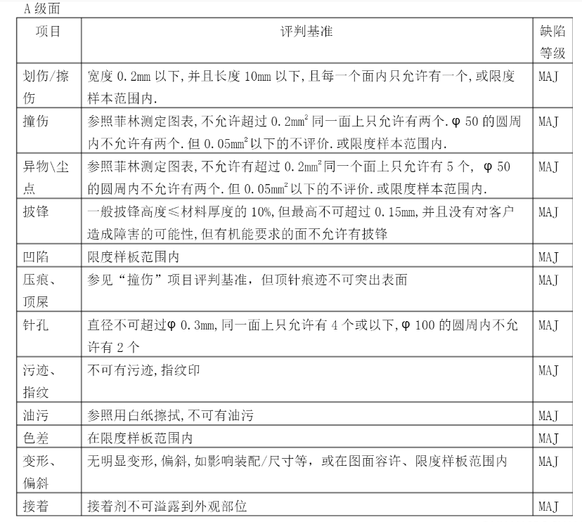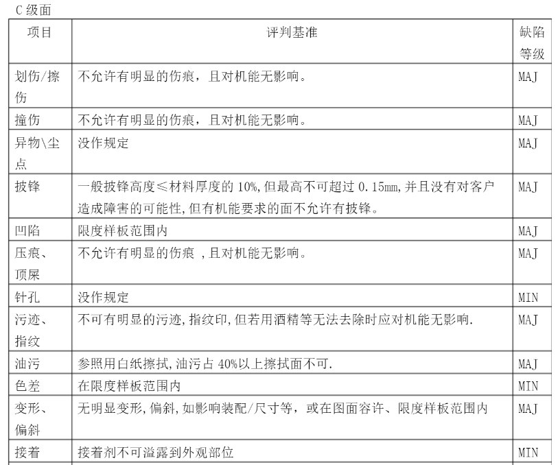 五金沖壓件等級(jí)要求一般分為三級(jí),分別按A級(jí)、B級(jí)、C級(jí)下面三張圖分別是五金沖壓件的檢測(cè)項(xiàng)目及三級(jí)檢測(cè)要求。